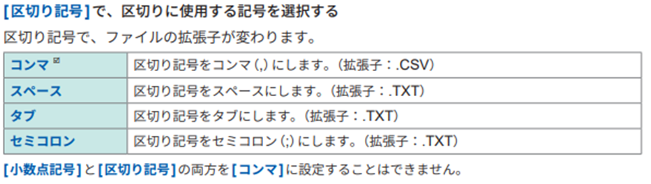 【データロガー】CSV形式で保存したい 2025年12月10日 23:46 更新 【お問合せ】データロガーLR8450で記録したデータをCSV保存したが、テキスト形式になってしまう(コンマ区切りになっていない)【回答】LR8450のデータ保存にはテキスト形式の設定があり、CSV形式で保存するには【区切り記号】で「コンマ」を選択します。 LR8450取扱説明書より抜粋 ※お客様から計測に関するお問い合わせのあった内容で、他の皆様にも参考になる情報を公開しています。※詳細につきましては取扱説明書、製品カタログ等を参照していただきますようお願い申し上げます。 関連 LR8450 関連記事 【MR6000 Viewer】MR6000 Viewerがインストールできない 【記録計】バイナリデータをCSV形式に変換したい 【LR8450】データの読み込み方法 <動画> 【データミニ】温度センサLR960xは水中に入れても良いか 【RM3545A】正常に測定ができません