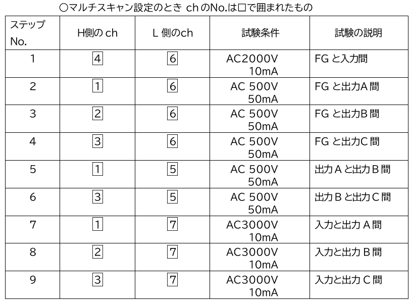 高電圧出力8ch とは別にある LOW 端子を共通端子とします。その共通端子と高圧端子(1~8)との間を 1ch ずつ測定できます。