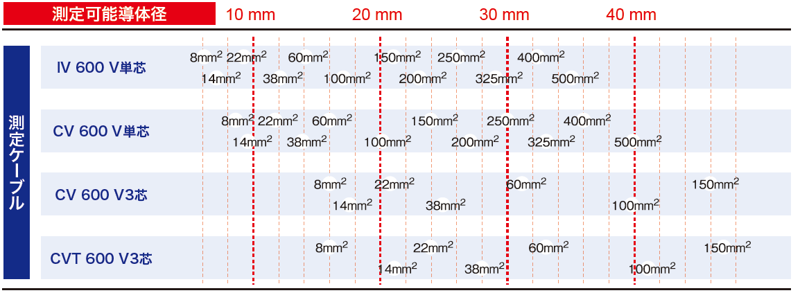 カタログに「測定可能導体径」という規定があります。IVやCVケーブルでは「何スケ」まで測定できますか?