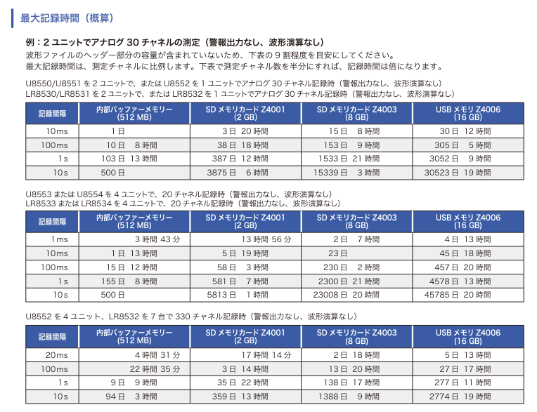 【データロガー】記録可能時間 2025年12月10日 23:48 更新 【お問合せ】メモリハイロガーでCFカードに連続記録するときの、記録可能時間を教えてください。【回答】以下、それぞれの製品カタログからの抜粋となりますので、ご参照ください。 LR8450 LR8410 ※LR8410は2024年12月に廃止となっております。 LR8431 ※お客様から計測に関するお問い合わせのあった内容で、他の皆様にも参考になる情報を公開しています。※詳細につきましては取扱説明書、製品カタログ等を参照していただきますようお願い申し上げます。 関連記事 【MR8870】記録長「連続」のときの記録時間 【データロガー】USBメモリの動作異常 【データミニ】クランプロガーでの電力測定 【メモリハイコーダ】CFカード(メディア)が一杯になったとき 【データロガー】湿度センサZ2000について