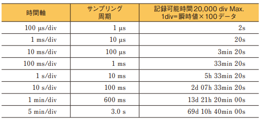 【記録可能時間=時間軸×記録長】※時間軸(TIME/DIV)=サンプリング周期×100データ