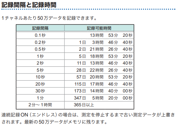 記録間隔100ms、連続記録「ON(ENDLESS)」だと50,000s=13.8hとなり、古いデータから消えていきますので、最後の13.8h(50万データ)が保存、表示されることになります。