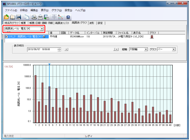 PW3360-11・PW3365の高調波データ、波形データはバイナリ形式(.HRM)で保存されますのでExcel®では直接表示することができません。高調波データをパソコンで解析するにはパワーロガービューワSF1001(別売)をご使用ください。