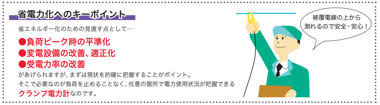 契約電力はデマンド値(30分ごとの平均電力)で決まり、デマンドの最大値で1年間の契約電力を決定します。現状どの程度電力を消費しているか測定するには、クランプオンパワーロガーPW3360などのクランプ式電力計がお勧めです。