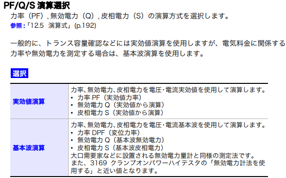 きれいな正弦波の電圧・電流であればどちらも同じ測定値が得られますが測定する電圧・電流波形によっては、この設定によって無効電力や皮相電力、力率の測定値が異なる場合があります。