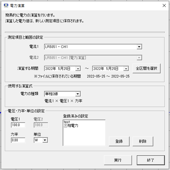 簡易的な電力計算として、無料アプリケーションソフト「データミニシリーズ LR5000用ユーティリティ:LR5000ビューワ」の中で電力演算が可能です。