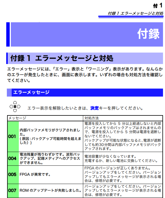 「エラー001」は波形バックアップ可能時間を超えた状態です。通常5分間電源が入っていると30分間は波形がバックアップされます。「エラー」というよりも「ワーニング」の意味合いが強いです。