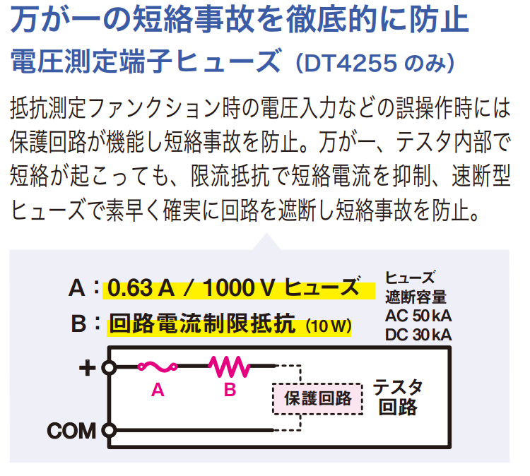 安全性重視の場合はデジタルマルチメータDT4255をお勧めいたします。保護回路に加え、電流制限抵抗と速断型ヒューズ(遮断容量AC50kA)で短絡事故を防止します。
